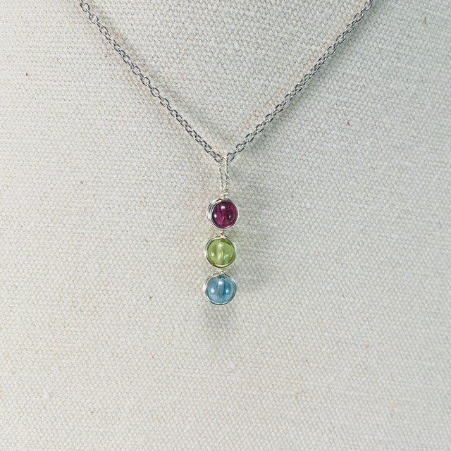 はなたまプチシリーズの3粒タイプのペンダントトップ。 だんご三兄弟のようなかわいさです(笑)。 色鮮やかに、ロードライトガーネット、ペリドット、アクアオーラ水晶、の4mm玉を組み合わせました。 アーティスティックワイヤー ターニッシュレジストシルバー使用。 サイズ:全長約2.4cm ※ペンダントトップのみでチェーンは付属しません。 ※試作品特価です。 ★ワイヤーアクセサリーについてご注意いただくこと★ ワイヤーラッピングでの作品は繊細な造りをしておりますので、衝撃や強い力が加わると変形の原因となります。 お取り扱いには充分ご注意ください。 リングやバングルなどはご使用により多少の変形が生じてきますが、指で優しく形を整えていただけますと長くご使用いただけます。 ペンダントトップは着用のまま激しい運動や、寝転んだり、シャワーを浴びるなどをなさいますと損傷する恐れがありますのでご注意ください。 汗などで汚れた場合は柔らかい布などで優しく拭き取り、乾いた状態で保管してください。 天然石を使用しておりますので、素材には個体差や原石由来の傷や凹みなどがある場合もあります。 それも個性としてお楽しみください。 他サイトでの販売もしております。 売り切れの際はご容赦くださいませ。 発送はオーダーメイド品以外は通常2〜3日で対応させていただきますが、諸事情により遅れる場合にはご連絡させていただきます。 【アーティスティックワイヤー】 銅線芯に色づけ、エナメル加工の上にクリア(無色)コーティングを施しているため、引っ掻きなどに強く、折る・曲げるなどを行っても色が剥げにくく加工のしやすいワイヤーで、比較的安価に様々な色が楽しめます。 ロットにより品質や色にややバラつきがあり、長期使用による擦れや傷からの剥げや変色もそれなりに発生します。 表面のナイロンコーティングが経年で黄変する場合もありますので保管場所は直射日光の当たらない場所をお勧めいたします。 ターニッシュレジストブラスだけは真鍮線に直接ナイロンコーティングがなされており、他のアーティスティックワイヤー よりも固めでしっかりとしています。 【14KGF】 メッキの約100倍の金の層を圧着したもので、長時間使用しても剥がれにくく、高級感がある質感の素材です。 お手入れ次第でK10、K18と同様に長く愛用いただけます。 また、個人差はありますが、アレルギーが出にくいお肌に優しい素材です。 ※すべての人にアレルギーが出ないということではありません。 【Silver925】 一般的に「シルバー」と呼ばれるアクセサリーで使われている素材のことで、92.5%のシルバーが含まれていることを表します。 銅などの金属を混ぜて銅と銀の合金にし、アクセサリーに加工可能な強度を持たせたものです。 経年で硫化という黒ずみが発生しやすいです。