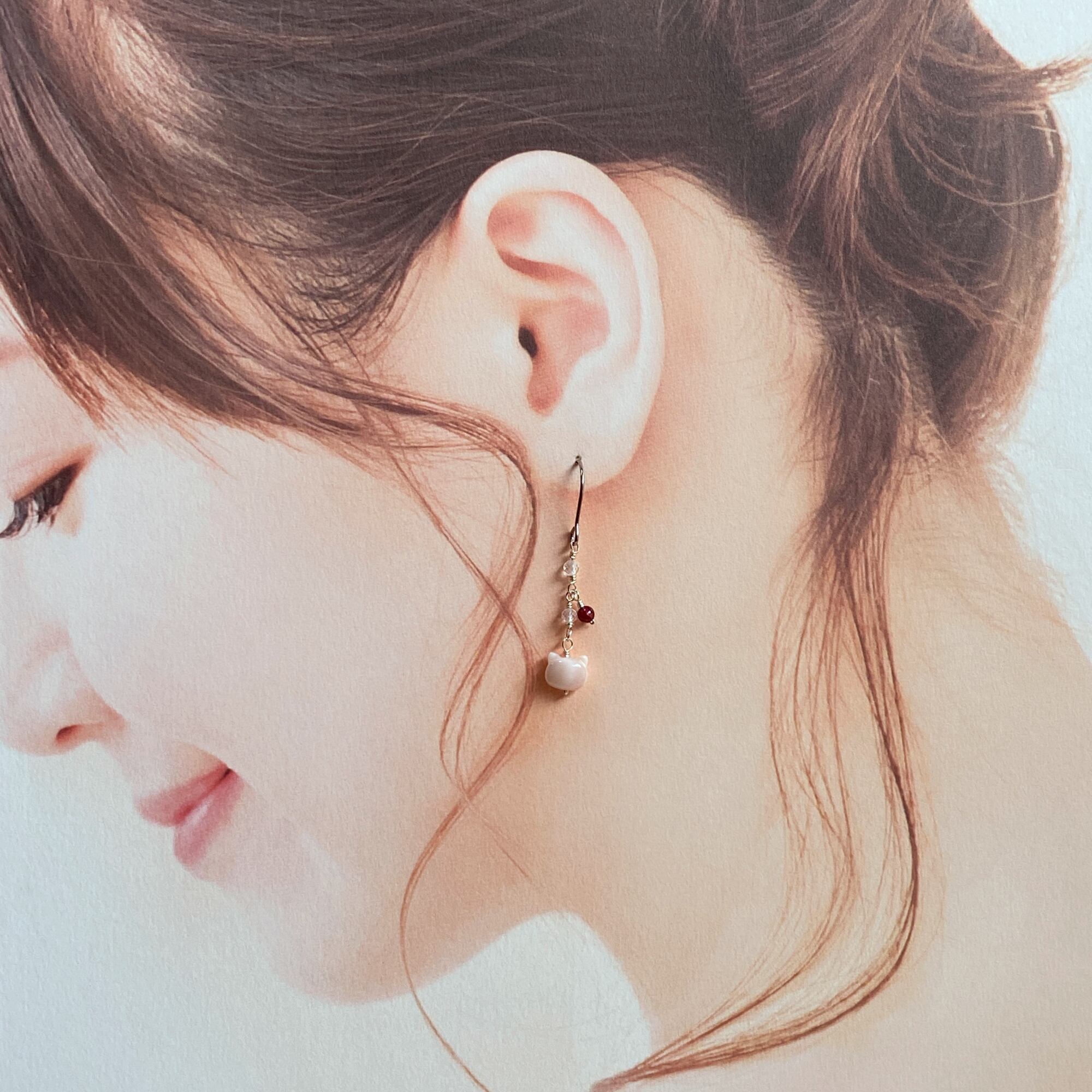使用材料:ピンクシェル猫モチーフ、水晶、ガーネット、アーティスティックワイヤー、サージカルステンレスピアスフック