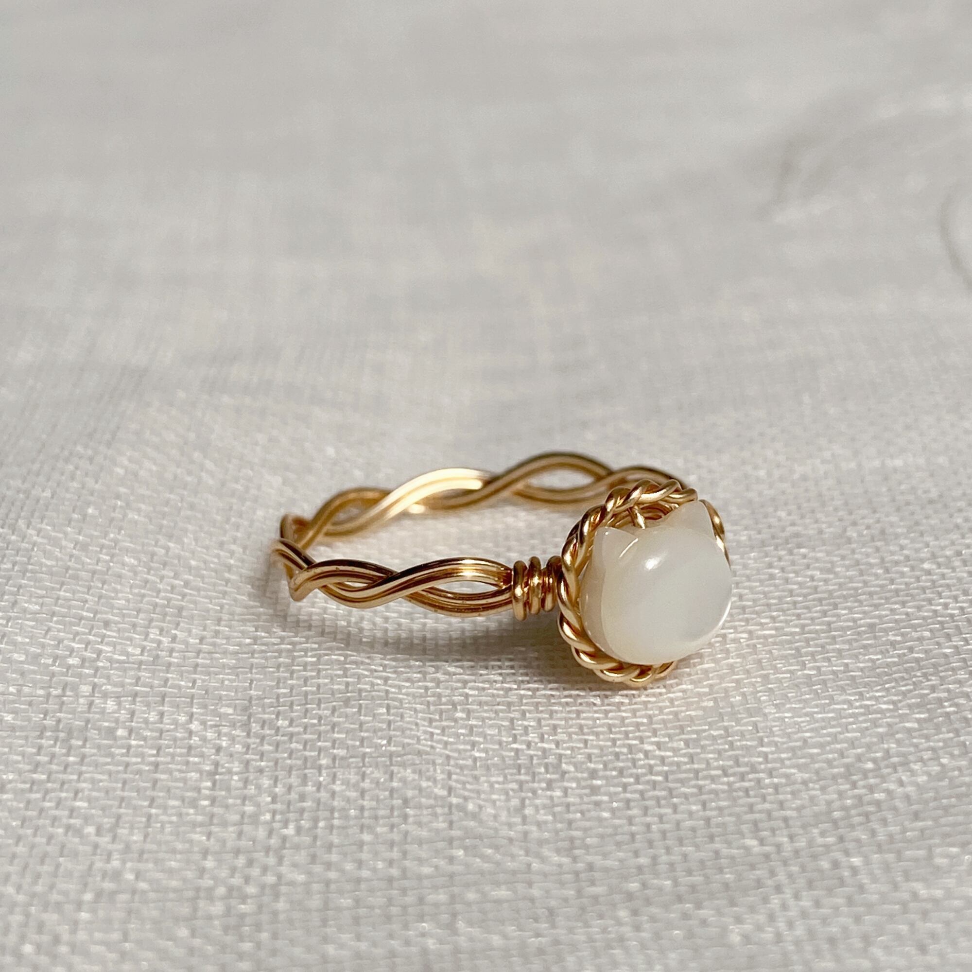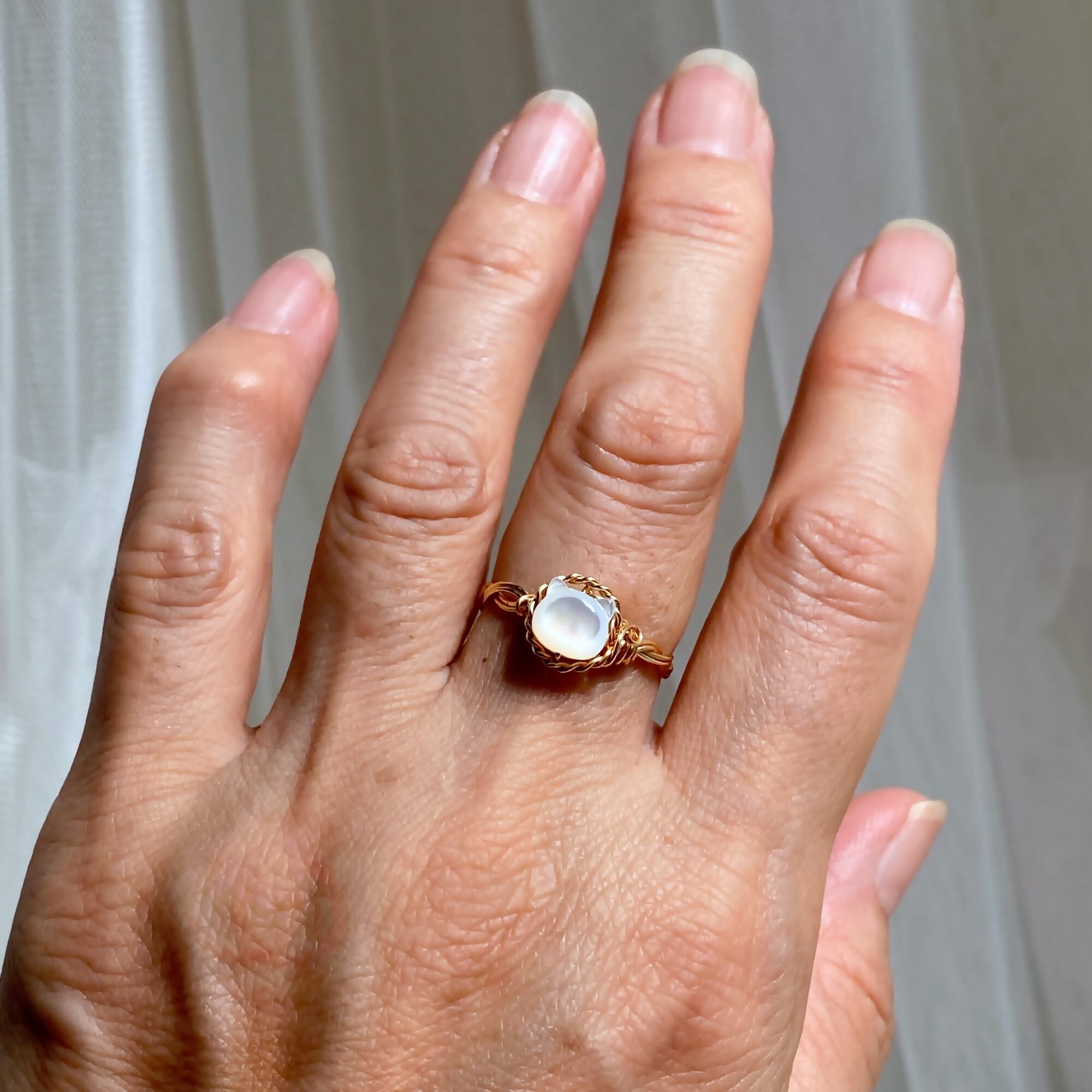 キラキラな輝きを持つホワイトシェル(マザーオブパール)で出来た可愛い猫ちゃんをアーティスティックワイヤーでリングにしました。