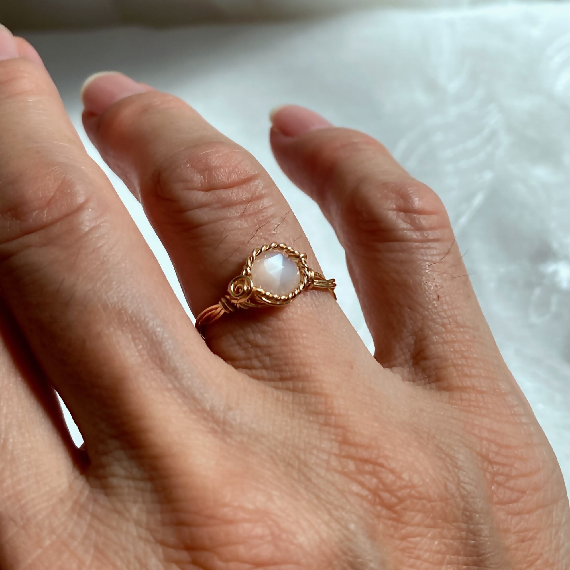 ローズカットが施され全方位からキラキラが見え透明度もある高品質なムーンストーンのルースをリングにしました。