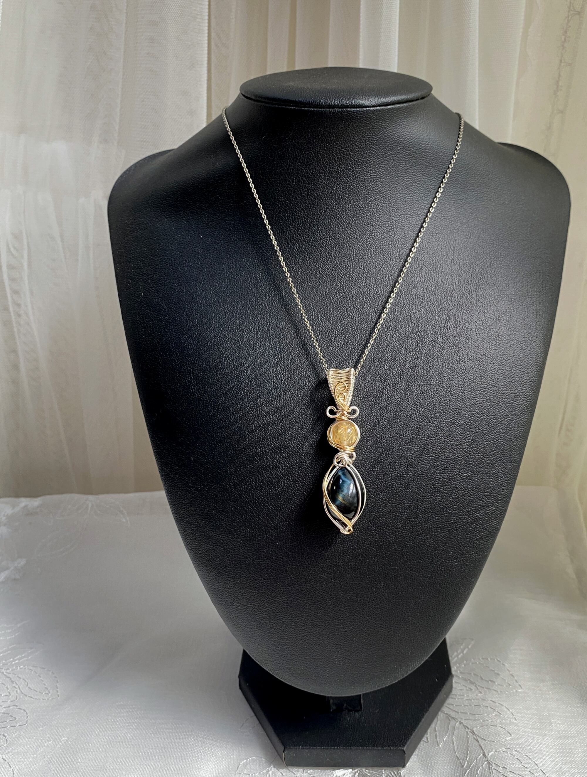 使用材料:ホークスアイ(ブルータイガーアイ)、ルチルクォーツ、アーティスティックワイヤー