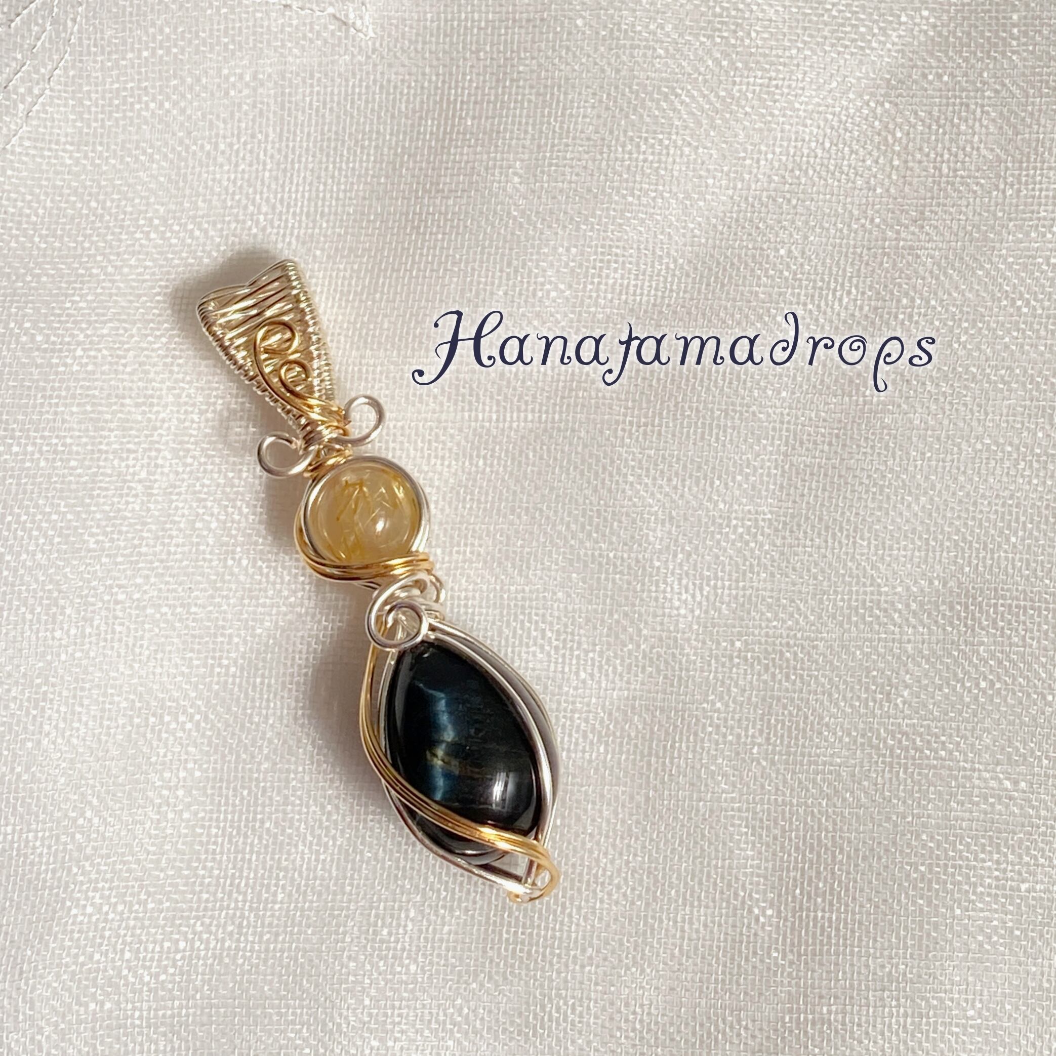 キラキラの金糸がしっかり入った黄金に輝くルチルクォーツのビーズをキャッツアイ効果が美しいホークスアイ(ブルータイガーアイ)に合わせてちょっぴり豪華な雰囲気のペンダントトップが出来上がりました。