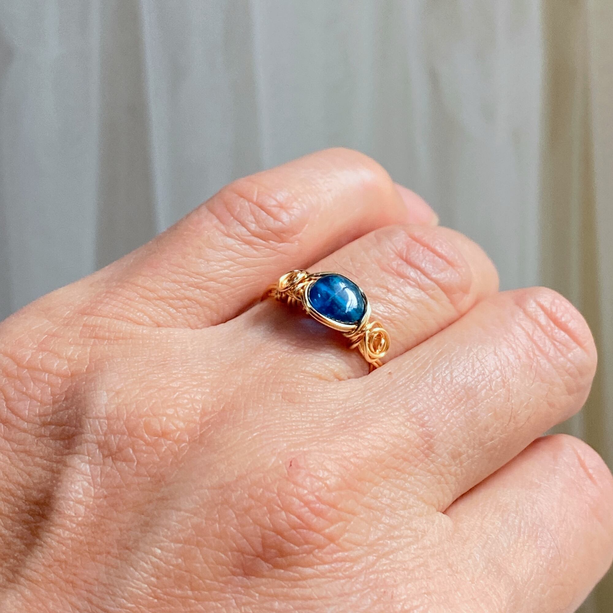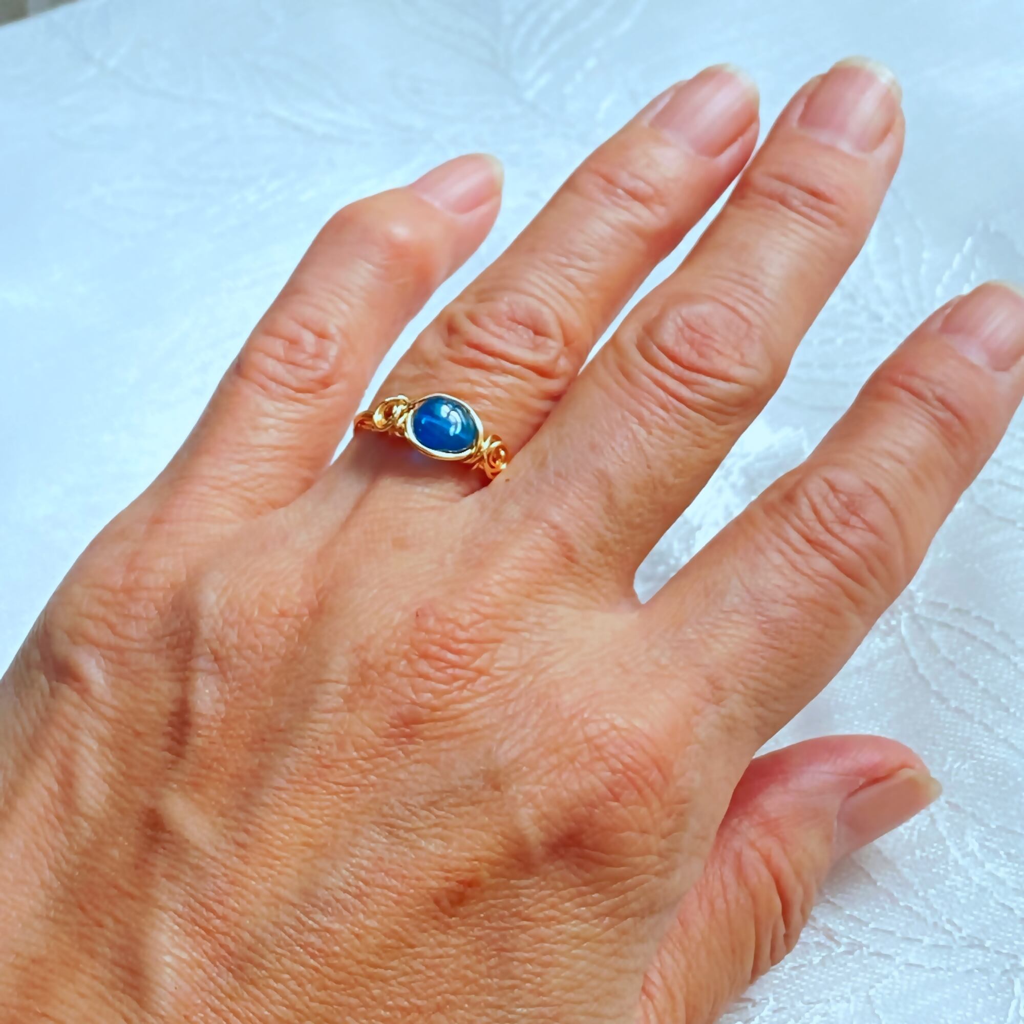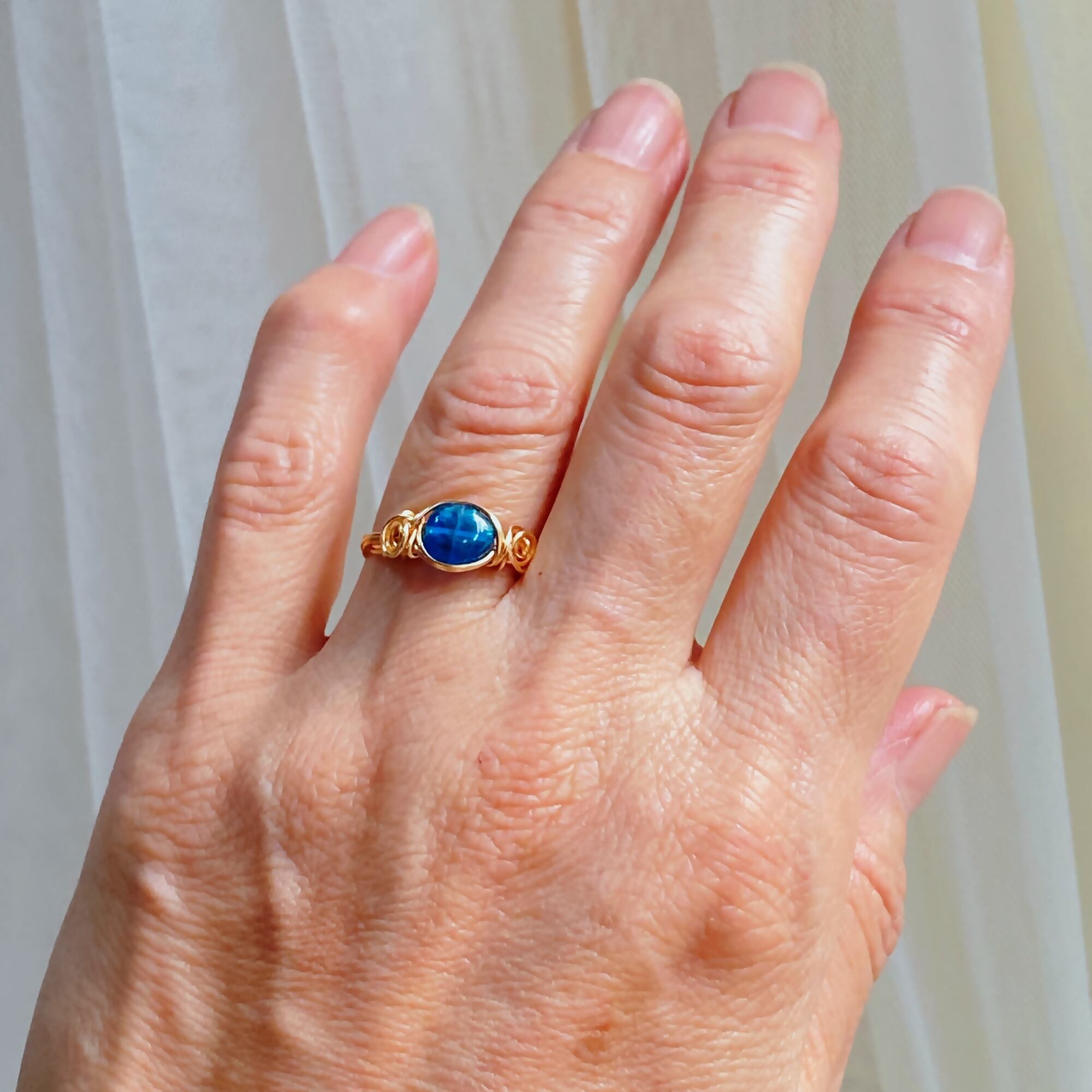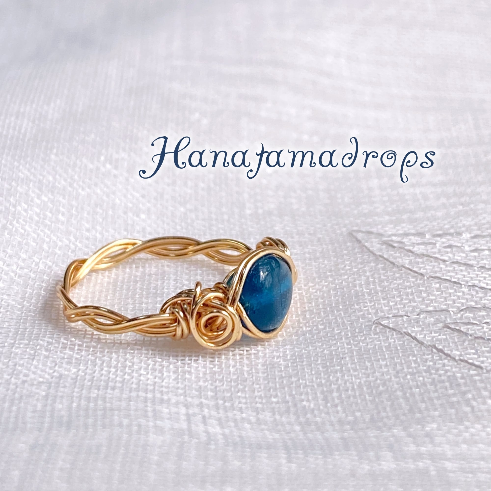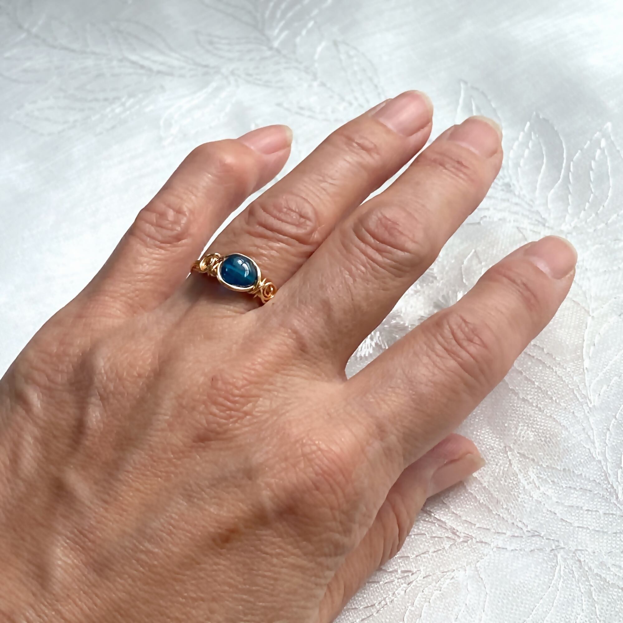 ややグリーン味のある鮮やかなブルーのアパタイトをリングに仕立てました。