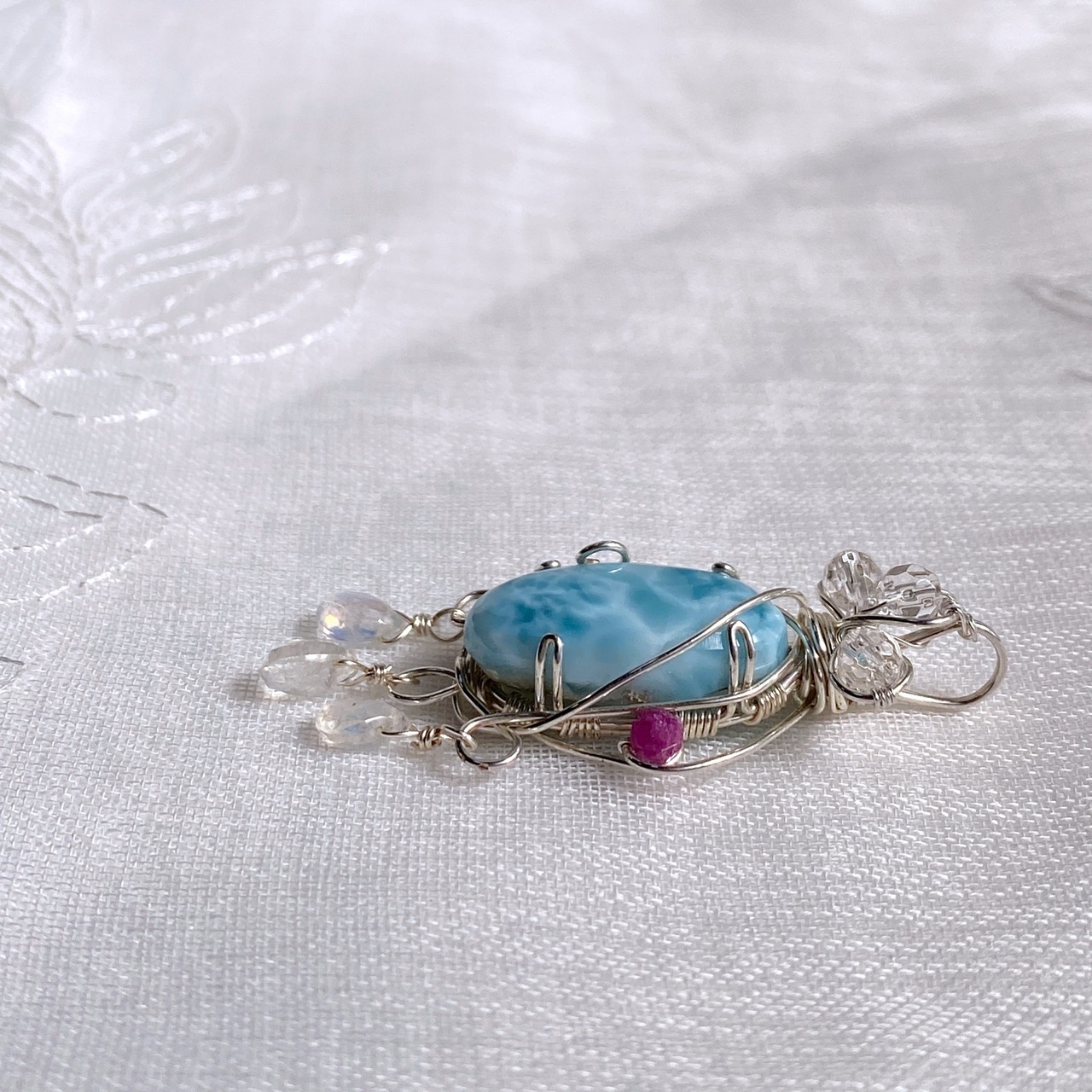 使用材料:ドミニカ共和国産ラリマー、水晶、ルビー、レインボームーンストーン(ホワイトラブラドライト)、アーティスティックワイヤー