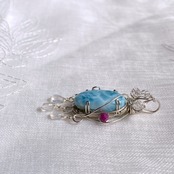 美しい波間模様を持つラリマーのルースをワイヤーアートならではの流れるような曲線でエレガントに巻き、まるでアンティークジュエリーのようなペンダントトップを作りました。