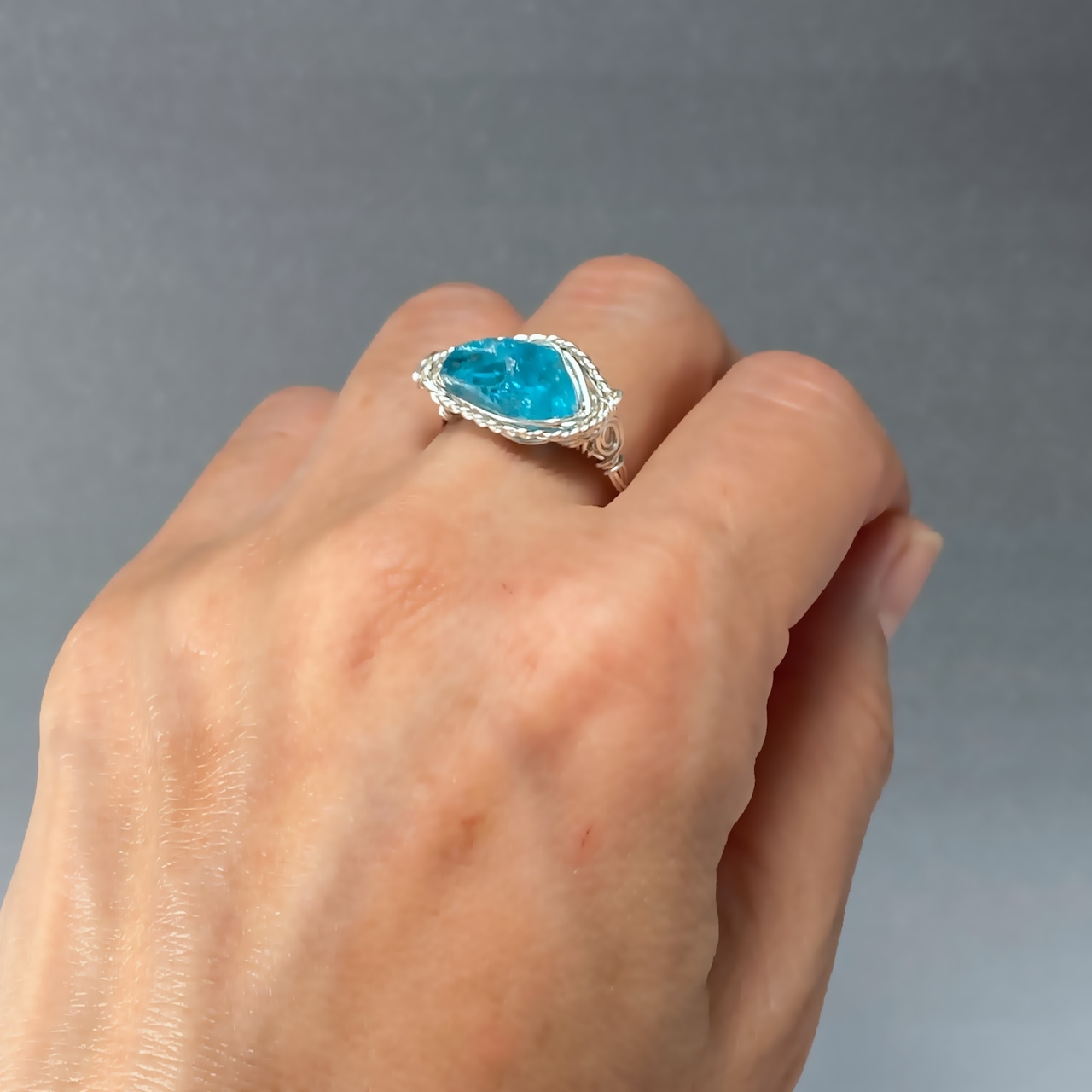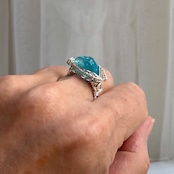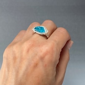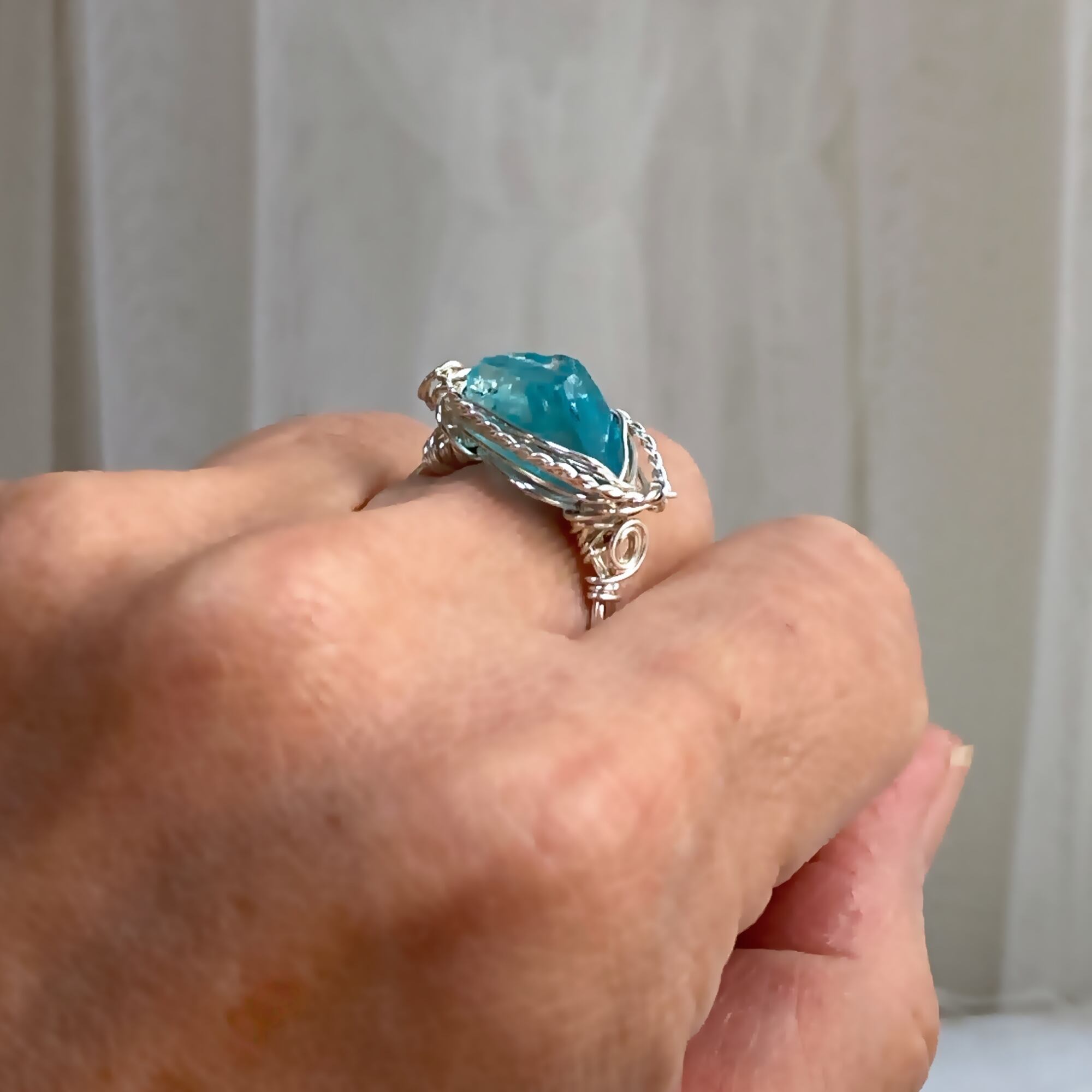 マダガスカル産の目の覚めるようなネオンブルーのアパタイトのかちわり原石を贅沢に使ってリングを作りました。