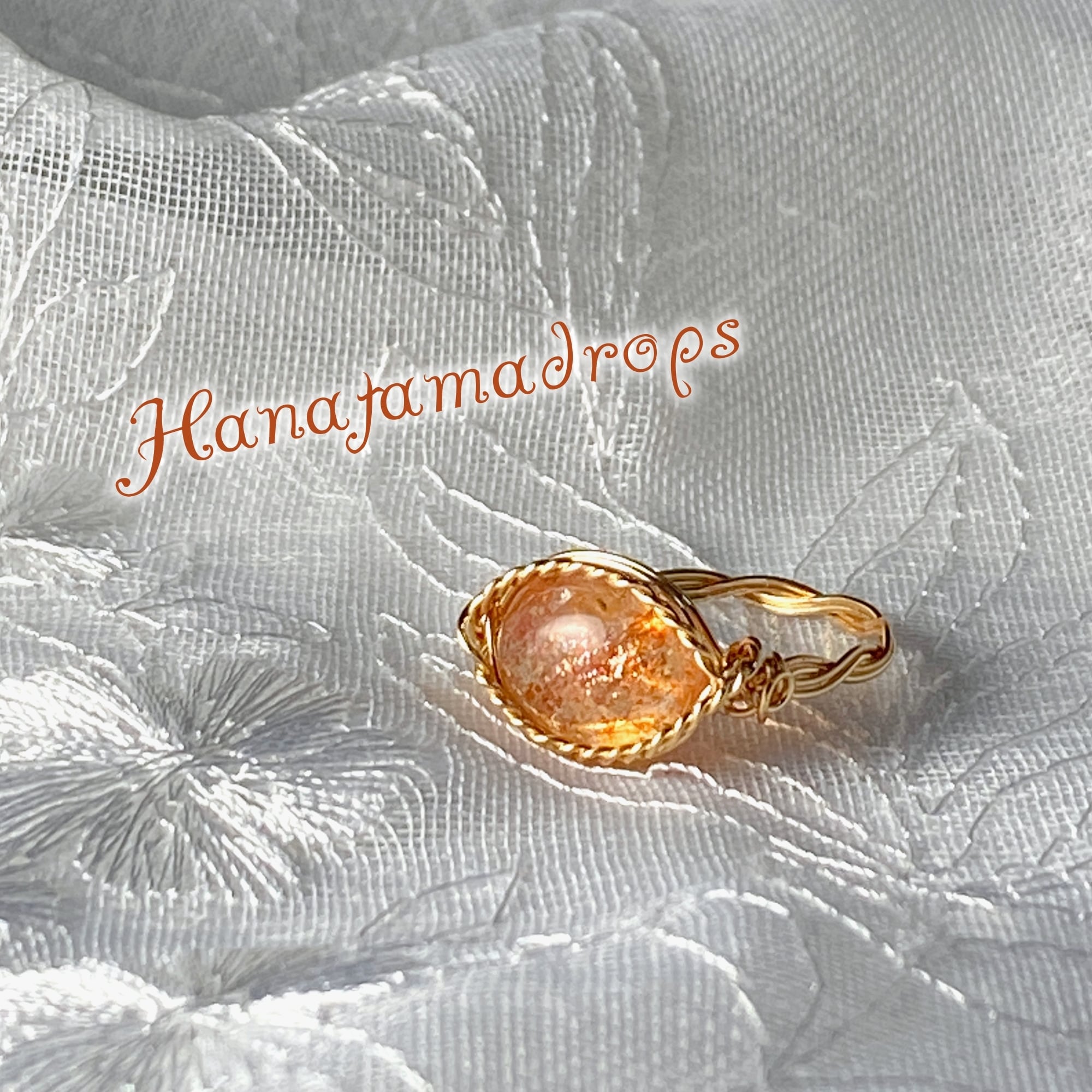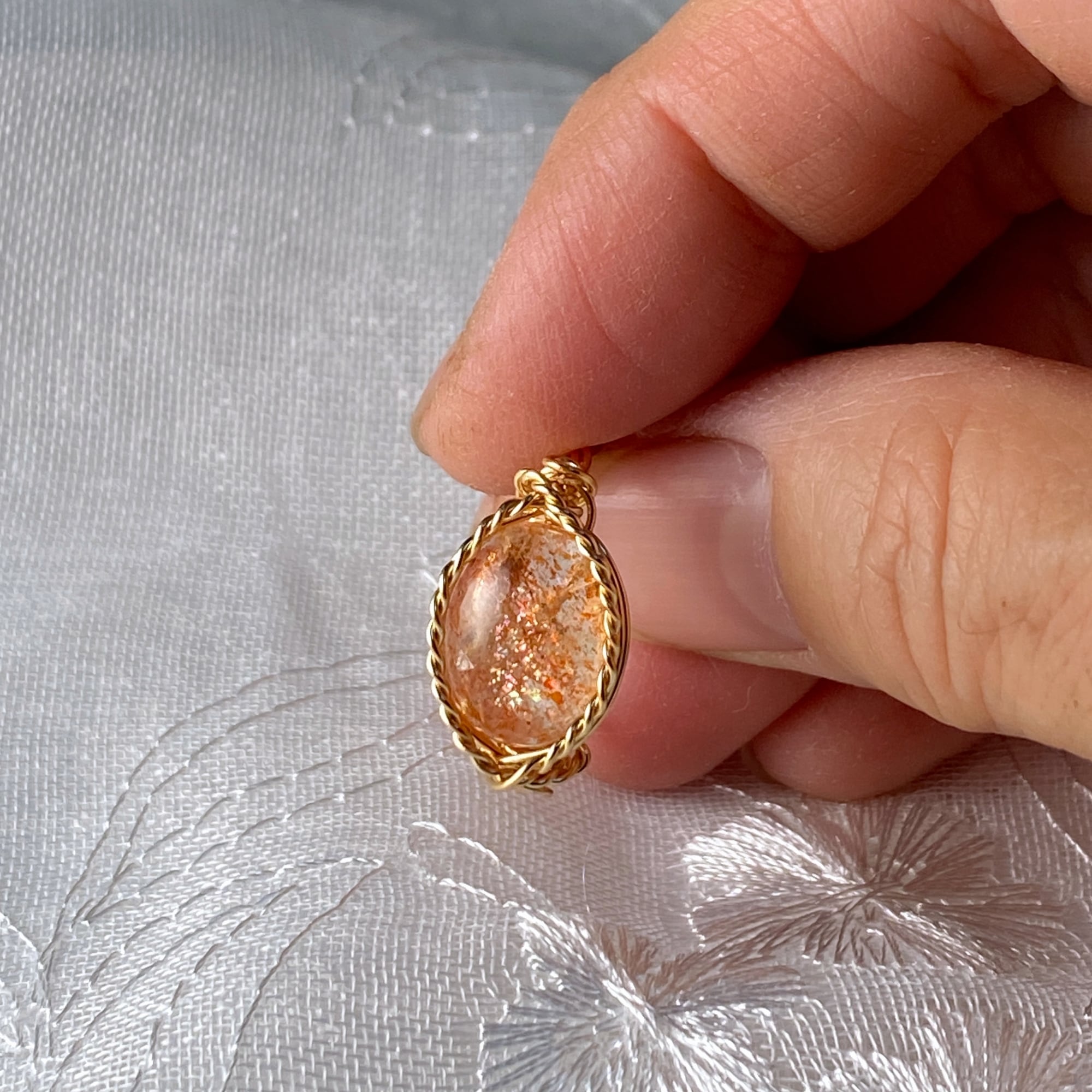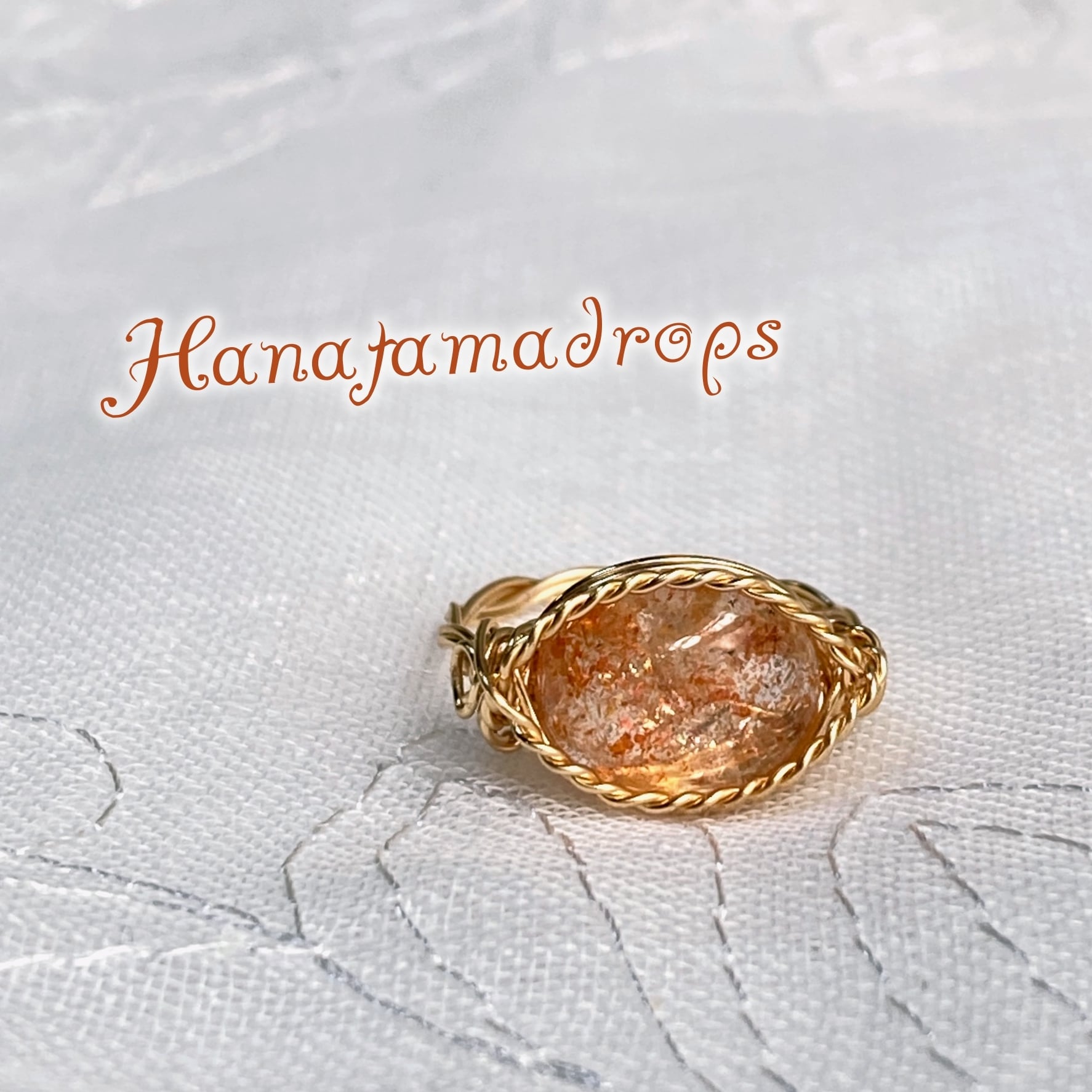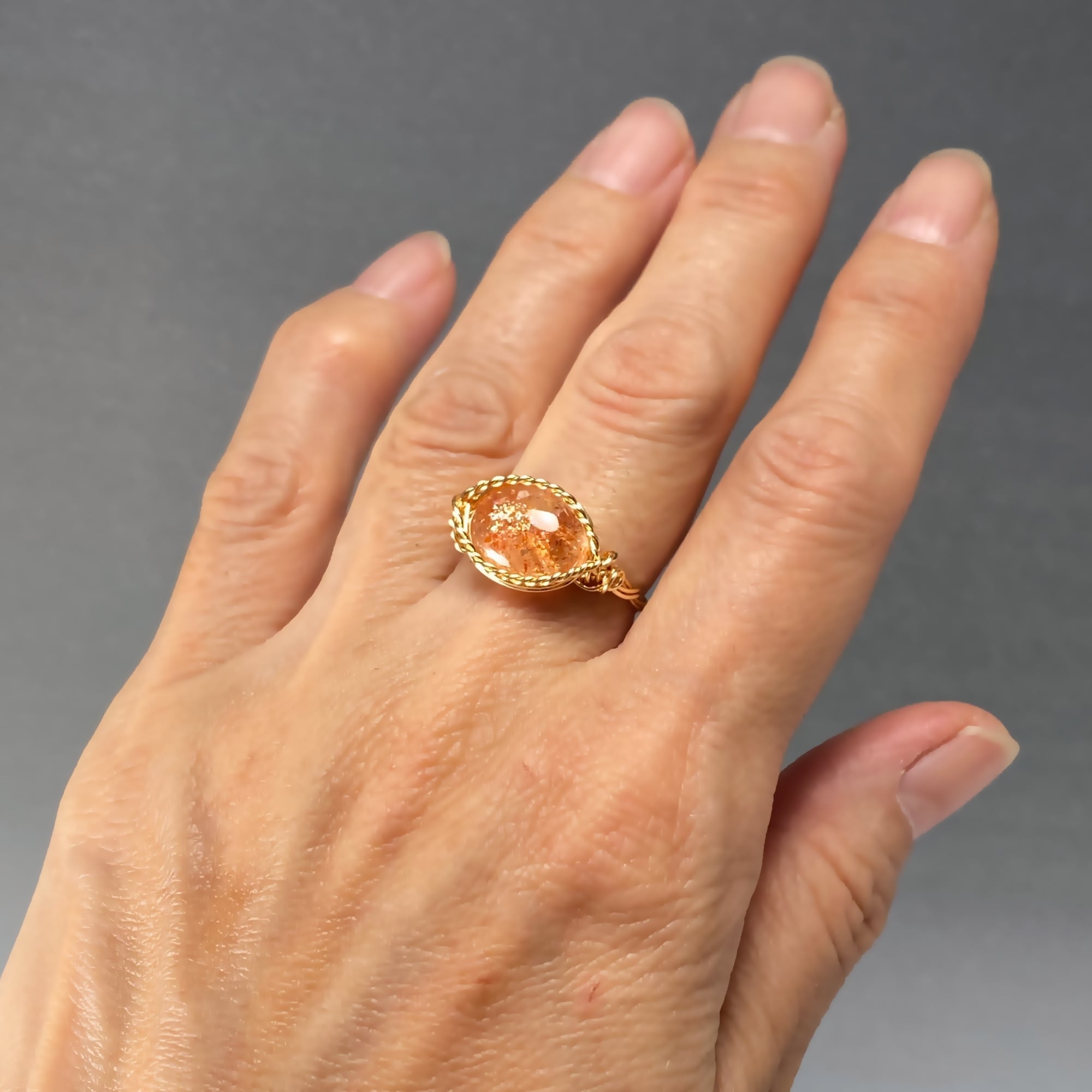 アベンチュレッセンスが美しいサンストーンを使い、キラキラで元気をくれそうなリングを作りました。