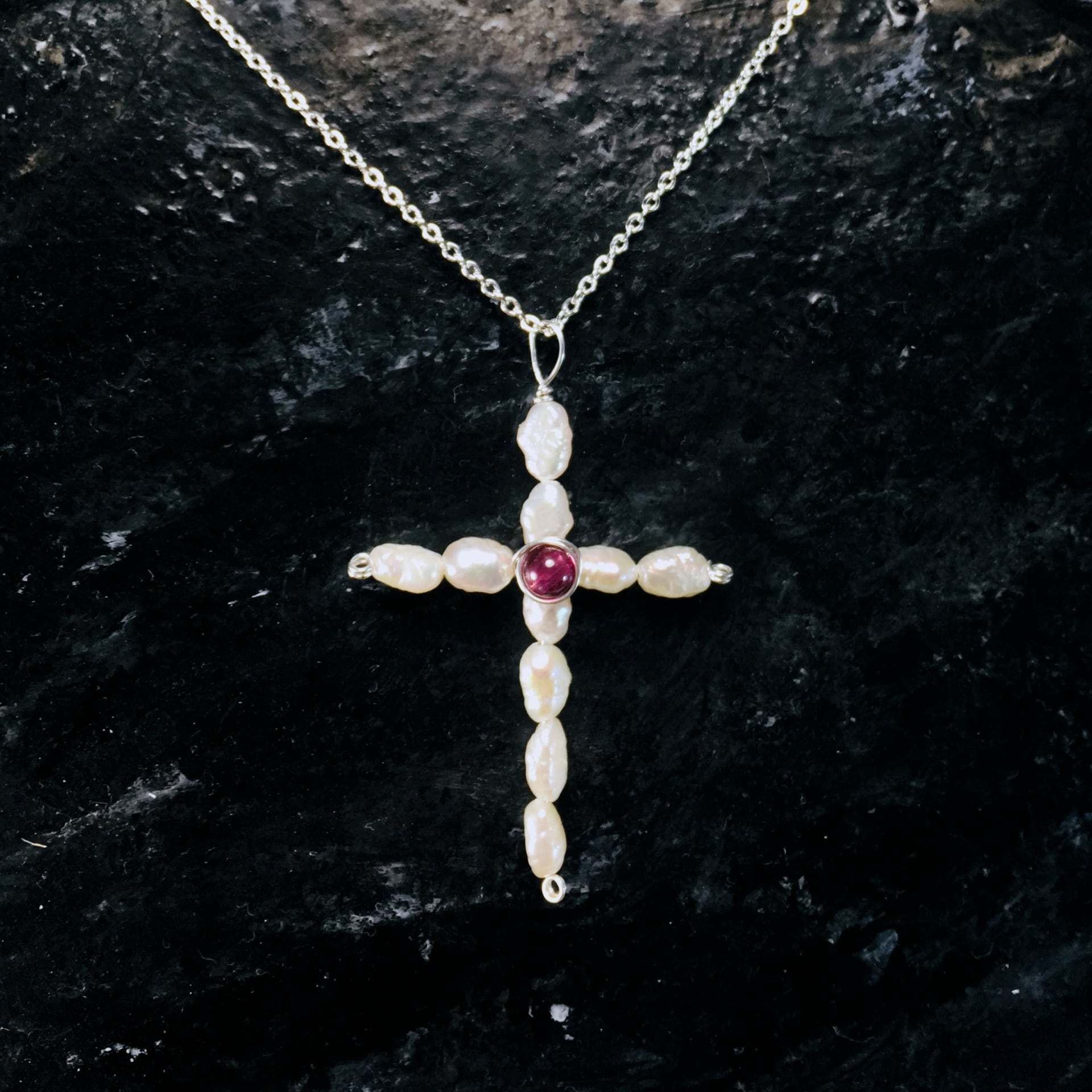 淡水パールで上品なクロスペンダントトップを製作しました。