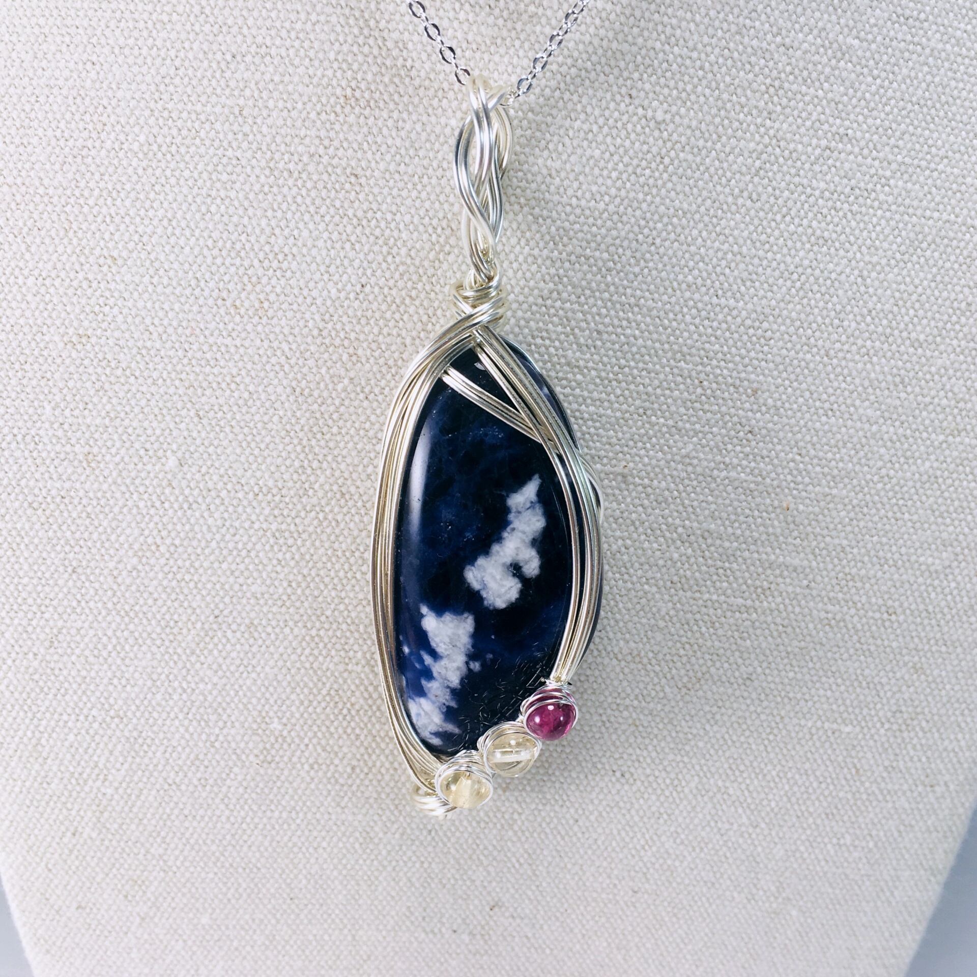 使用材料:ソーダライト、シトリン4mmx2、ロードライトガーネット4mm、アーティスティックワイヤー