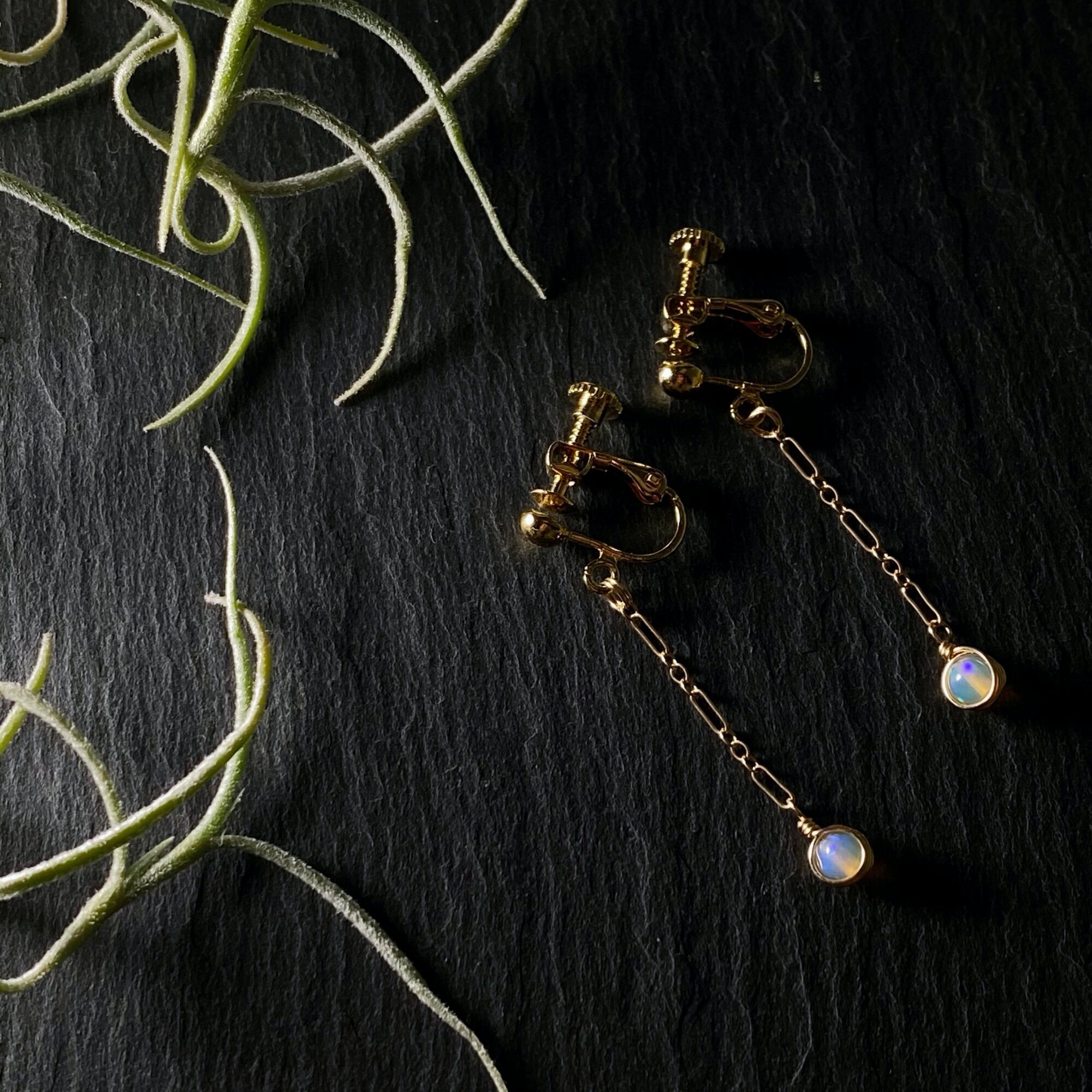 使用材料:エチオピアオパール4mm、14KGFワイヤー、14KGFチェーン、合金製イヤリングパーツ