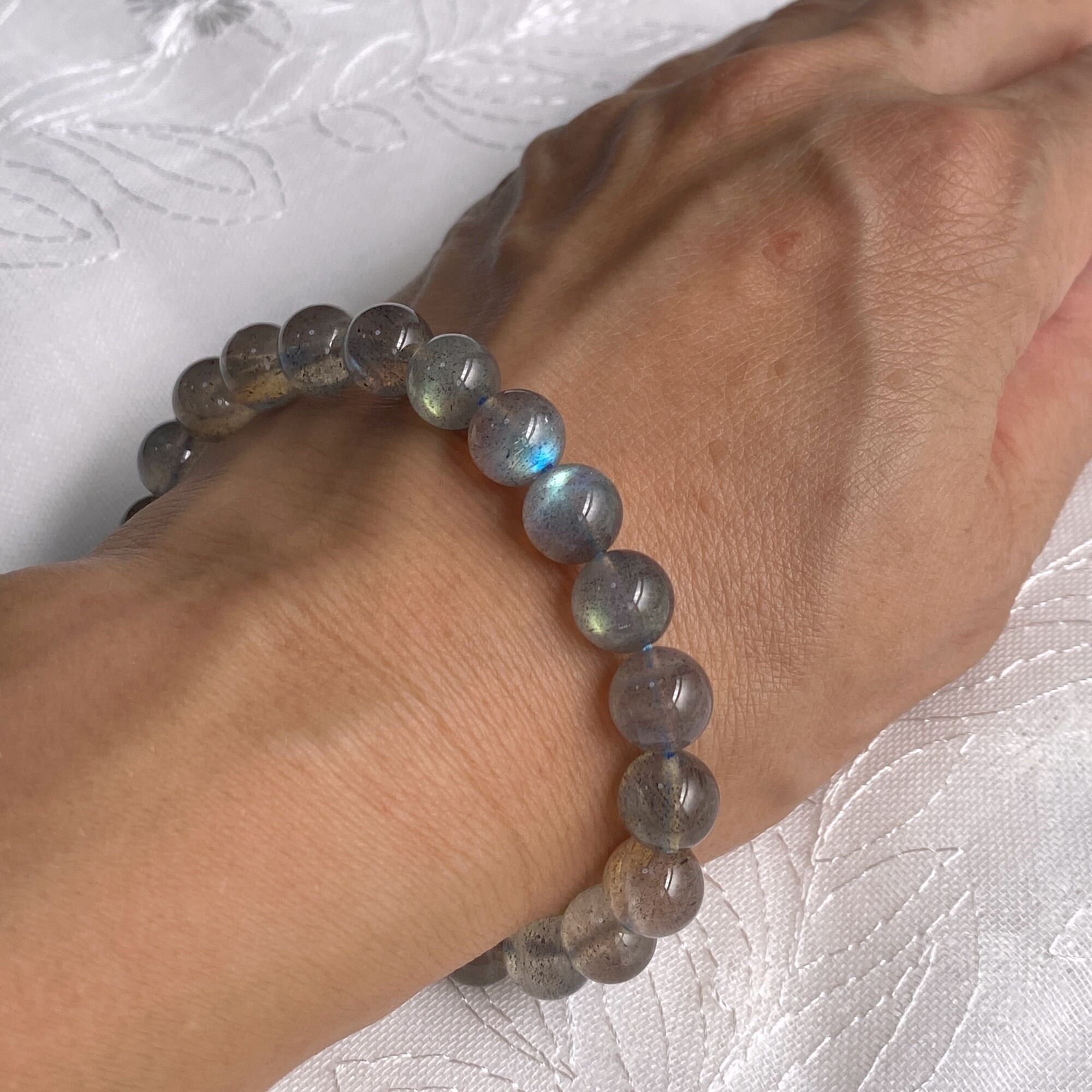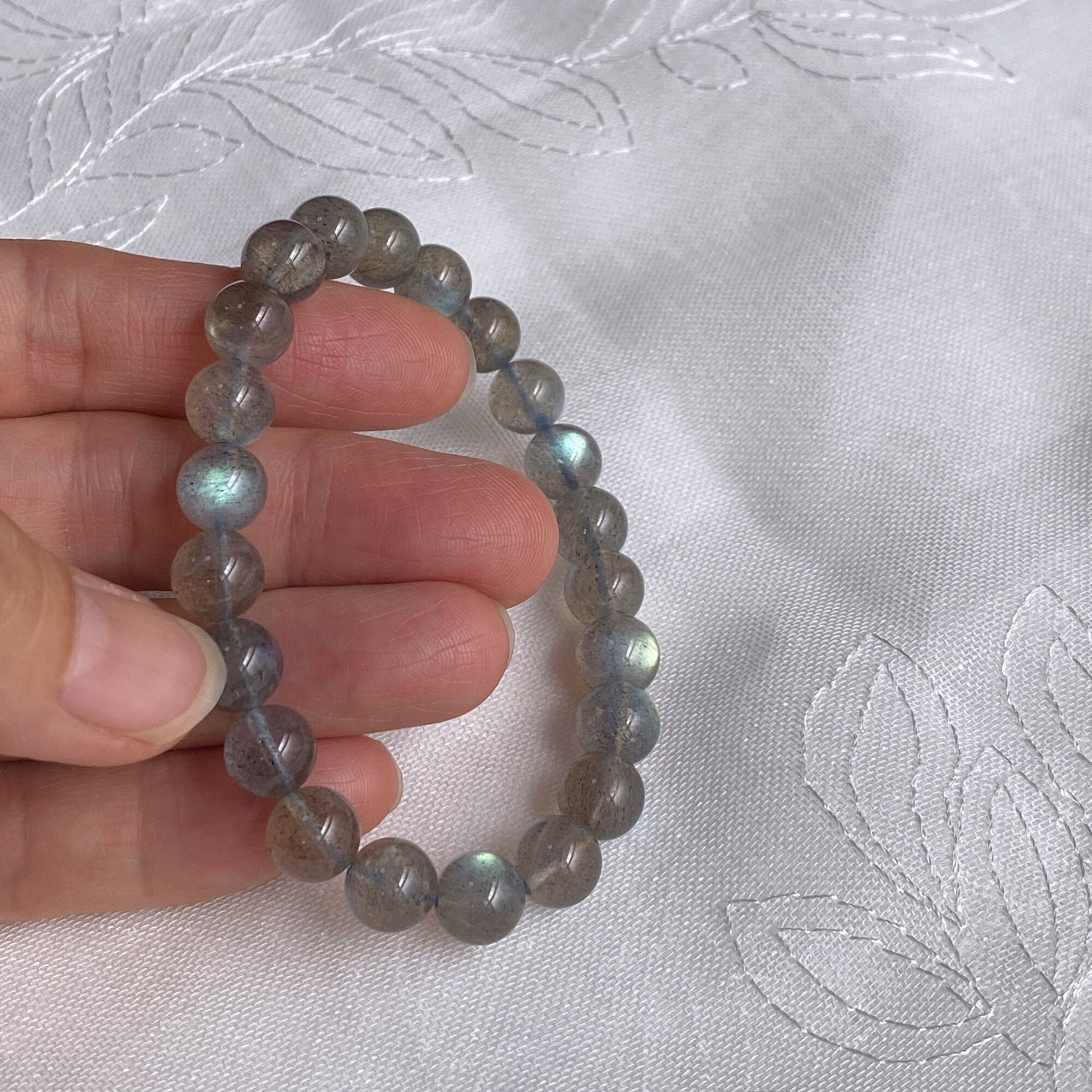ベースの石全体に透明感があり、ライトグレーなのでラブラドライトのブレスレットとしては珍しく軽やかな印象さえ受けます。