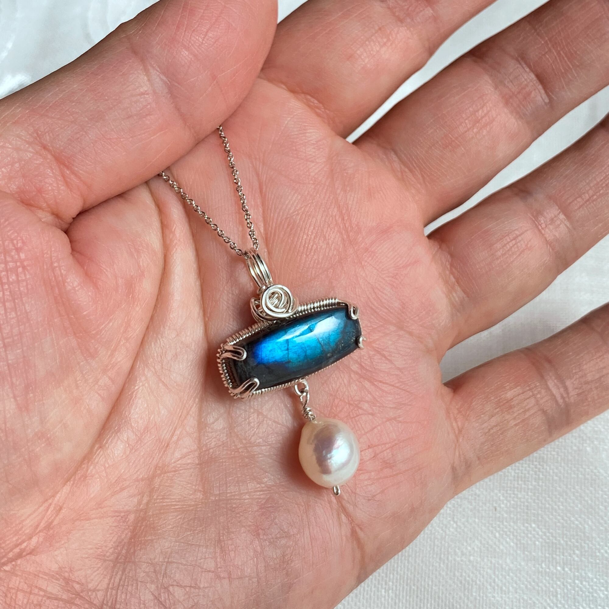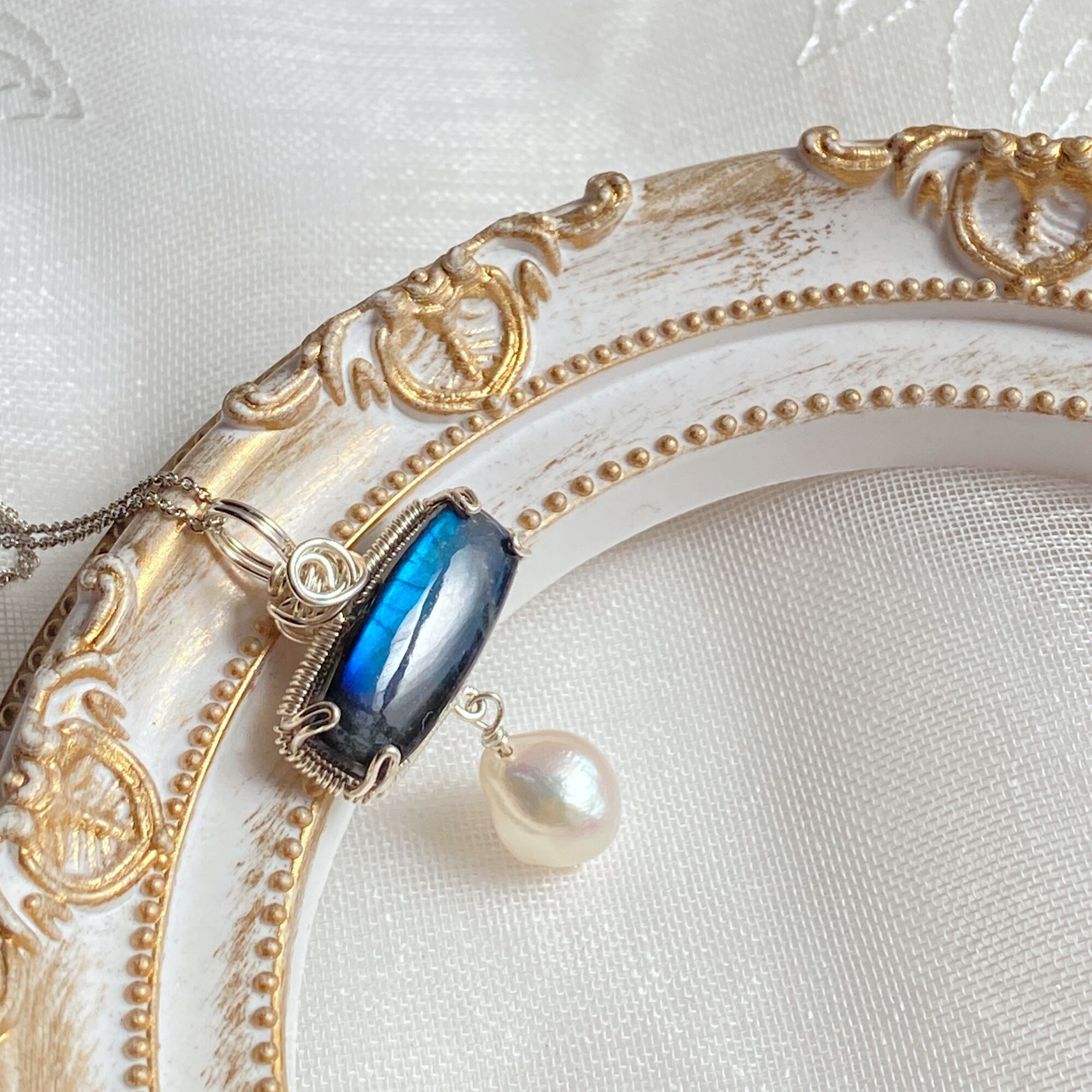 使用材料:マダガスカル産ラブラドライト、淡水パール、アーティスティックワイヤー