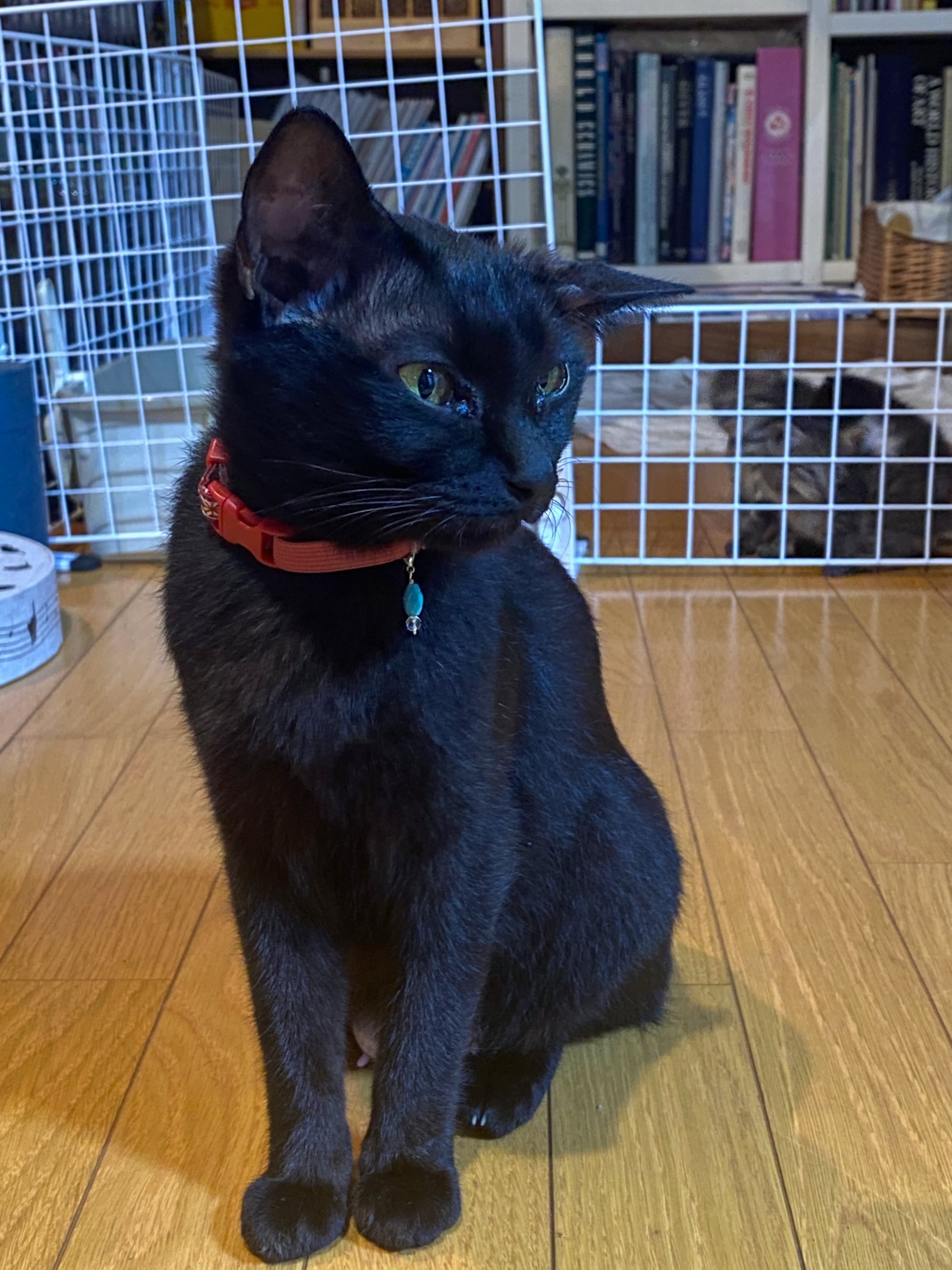 もともとほぼ野生で暮らしていたために完全室内飼いを試みたところかなりのストレスなようだったので、居住地区が山中でほとんど車通りがないことなどから出入り自由へと移行しました。