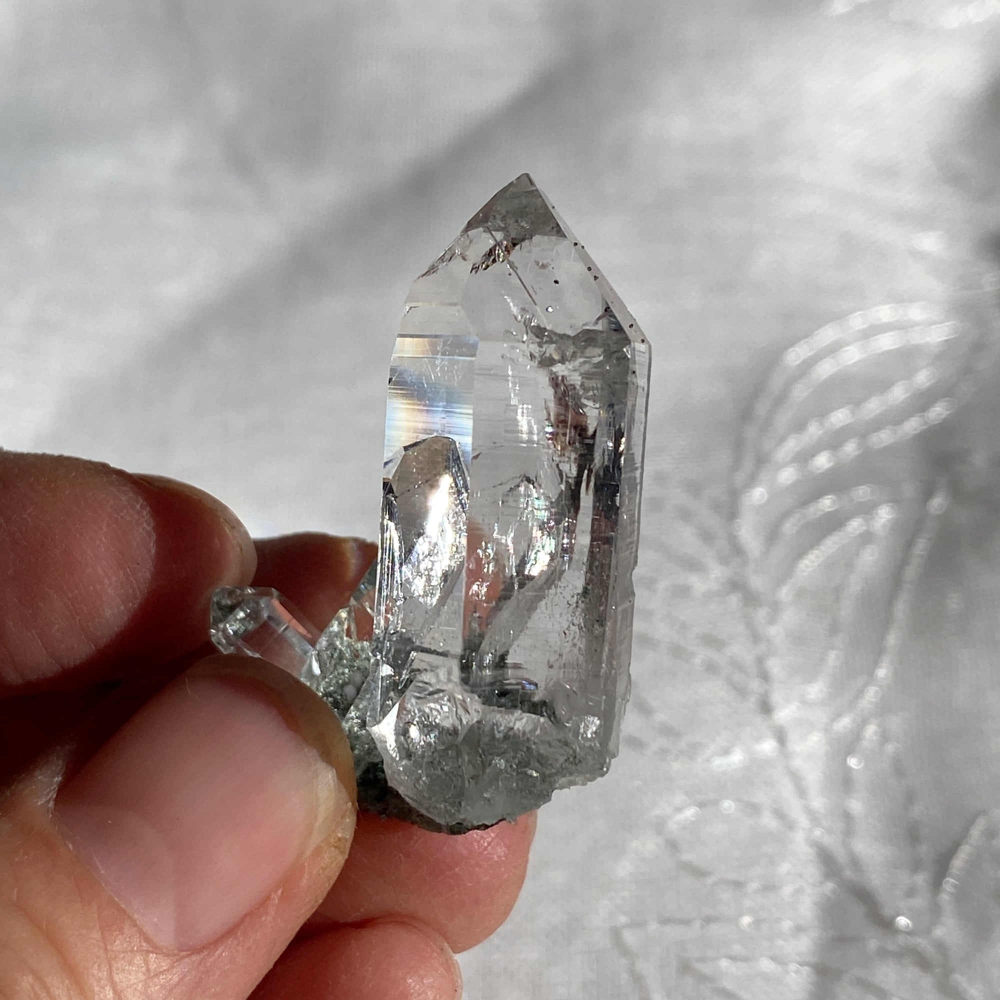 キーンとするような鋭ささえ感じる透明度、表面の照り艶も素晴らしく、内包するクローライトによる美しい景色、よく見るとクローライトの中にチラチラと生えているかのように見えるルチル、そしてポイントの錐面に細かなアナテース(チタンの酸化鉱物)の結晶。