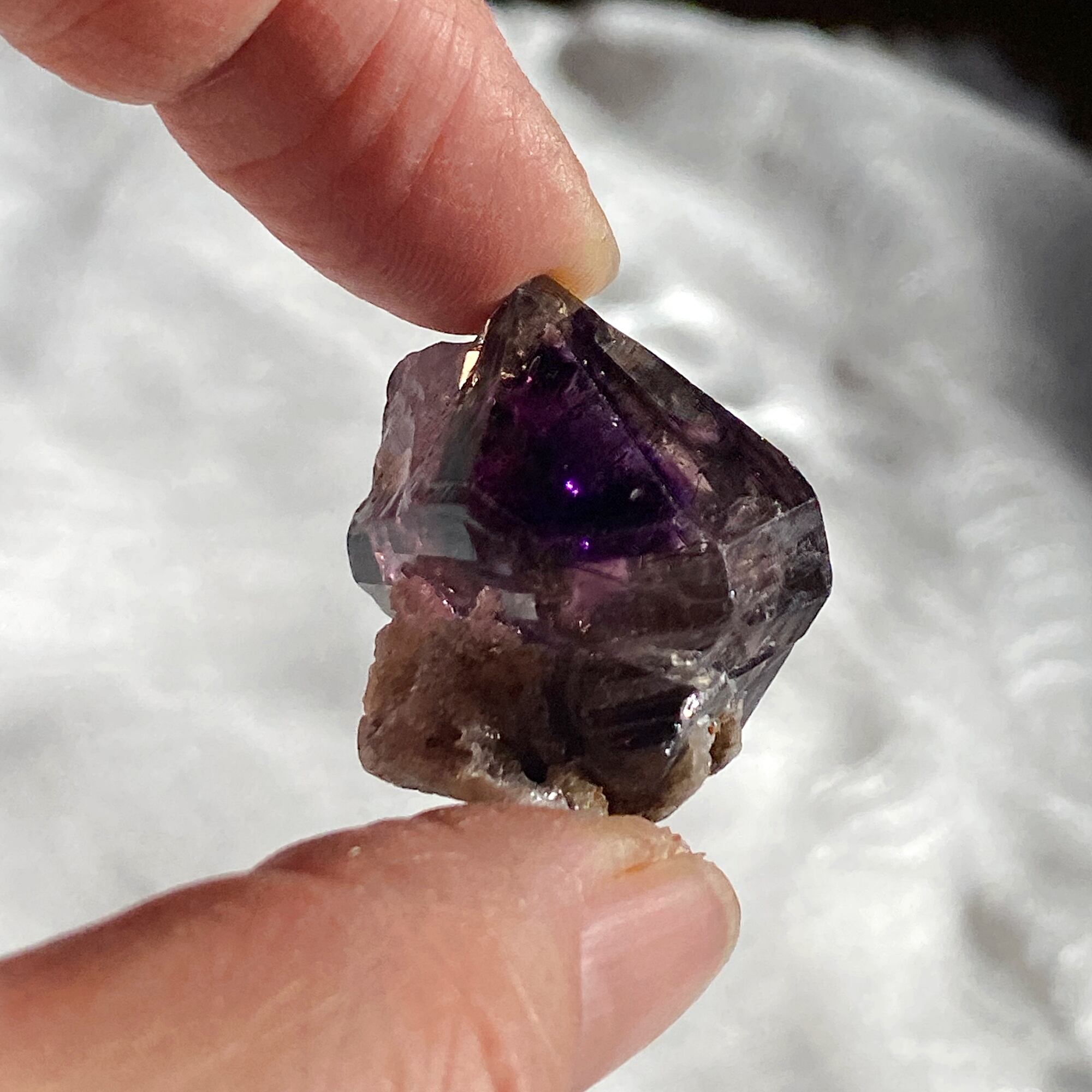 角度により透明な部分と紫色の部分がくっきり分かれてるのが見えたり、スモーキークォーツ部分が見えたりと見どころ満載。
